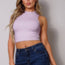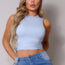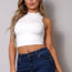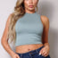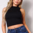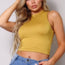 Made In U.S.A S.M.L High neck racerback crop tank top. Sleeveless. Mock neckline. Racerback detail Fully double-faced. Body sculpting fabric. High stretch for comfort 62% Viscose 33% Nylon 5% Spandex Ivory CEF