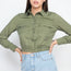 Imported S.M.L A woven shirt in a solid color, featuring a basic collar, long roll-tab sleeves with buttoned cuffs, high-polished button down front, chest flap pockets, and an elasticized cropped waistline. 100% Lyocell Olive IRI