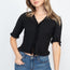 Imported S.M.L A knit mini cardigan featuring a button-down front, a V-neckline, short sleeves with ruffle trim hem, and a cropped length with a flounce hem.. 100% Polyester Black IRI
