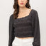 Imported S.M.L.XL METALLIC FABRIC WITH CROP SMOCKED TOP AND SQUARE NECK. 7% Lurex 3% Spandex 90% Polyester Black LOV