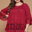 Imported 1XL.2XL.3XL Solid woven button-down blouse featuring a round neckline, 3/4 length sleeves and sheer lace hem details. 100% Cotton Burgundy ODD