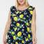 Made In U.S.A 1XL.2XL.3XL Sleeveless top featuring a fun lemon print, a high-low hemline, and lace inserts on back and sides 96% Polyester 4% Spandex Navy/Lemon POL