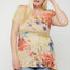 Short sleeve printed tunic, featuring a multi-colored watercolor flower print, short sleeves, a round neck, and an asymmetric hem.