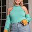 Mint green, solid color, ribbed knit construction, off-the-shoulder long sleeve, high neck back & front with collar detail, lettuce hem detail on shoulders & neckline, double snap button closure bottom, unlined, stretchy, casual, cute, warm & cozy, lounge wear, comfy, sexy, playful, fall/winter collection