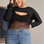 Imported 1XL.2XL.3XL Overtop features: Black, solid, extreme crop, round neckline, long balloon-y sleeve, raw hem detail, unlined, slight stretch, relaxed fit Bodysuit features: Black, scoop neckline, sheer beach net construction with front chest underlining cover, sleeveless, non-adjustable shoulder straps, non-stretch, double snap button closure bottom, regular fit. Casual, sexy lounge wear, club wear, stylish, fall/winter collection 100% Polyester Black TSH