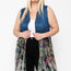 Made In U.S.A 1XL.2XL.3XL Sleeveless, lace cardigan featuring a long silhouette, a denim inspired bodice, and a skull sublimation print. 33% Rayon 63% Polyester 4% Spandex Denim Blue/Multi POL