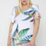 Flutter sleeve top featuring a multicolored feather sublimation print, a scoop neck, and a banded hem