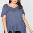 high-low design, raw hemline, v-neckline, unlined, solid, short sleeves, asymmetrical hem.