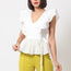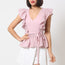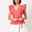 Imported S.M.L -Crotchet Peplum top w/ self -front tie -V-Neck with ruffle front designs and on shoulder -Zipper on the back 48% Rayon 52% Nylon Dusty Rose VAL