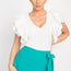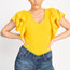 A woven ribbed shirt in a solid color, featuring a v-neckline, ruffle tiered short sleeves, and a waist length.