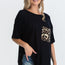 Made In U.S.A S.M.L Short sleeve top featured in a Round neckline and animal print pocket accent. 65% Polyester 30% Rayon 5% Spandex Black CYF