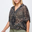 Imported 1XL.2XL.3XL Floral scarf printed button-up blouse with collar detail, cuffed short dolman sleeves, and bottom band 100% Polyester Black HAU