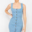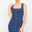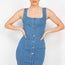 Imported S.M.L A stretchable denim mini dress featuring a square neckline, a sleeveless cut, a front button-up tab with accent buttons, thick shoulder straps, and a mini length. 45% Cotton 30% Rayon 23% Polyester 2% Spandex Dark Denim IRI