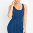 A woven denim mini dress featuring a scoop neck, thick shoulder straps, on-seam construction, padded cups with underwire,