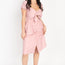 Imported S.M.L A knit dress featuring a solid color, short sleeves with ruched hem, a front tie cutout, a front button closure, a smocked back, and a knee length.. 85% Rayon 15% Nylon Pink IRI