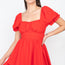 Imported S.M.L A knit dress featuring solid color, square neckline, short puff sleeves, ruched details, wrapped waistband, back tie, back-zip closure, and a frill hem. 100% Polyester Red IRI