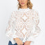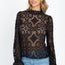 Imported S.M.L A sheer knit top featuring an floral and geo crochet lace, a mock neck with lace trim, long sleeves with bell cuffs, a back keyhole with button loop closures, and a waist length. 55% Nylon 45% Cotton Black IRI