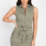 Imported S.M.L A woven mini dress featuring a basic collar, removable self-tie sash belt, front zip-up closure, front flap cargo pockets with button closures, and a bodycon silhouette. 98% Cotton 2% Spandex Light Olive IRI