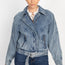 Imported S.M.LA woven jacket featuring a denim wash, zip front closure, side zip pockets, a belted waist, collar, long sleeves, and a ribbed hem. 100% Cotton Medium Denim IRI