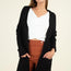 Imported S.M.L. A knit solid color sweater cardigan featuring an open front, long sleeve, front patch pockets, and long line length. 65% Acrylic 32% Nylon 3% Spandex Black IRI