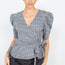 Imported S.M.L A knit top featuring a plaid pattern, front wrap design, surplice neckline, short puff sleeves, peplum hem, side self-tie closure, and waist length. 98% Polyester 2% Spandex Black/White IRI