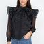 ImportedS.M.L A woven semi-sheer chiffon top featuring a front bow tie, ruffled trim along the yoke and ruffle top sleeves design with long sleeves, button cuffs, a and a button-down front.100% Polyester Black IRI