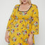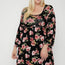 Made In U.S.A 1XL.2XL.3XL Floral print dress featuring a flattering babydoll silhouette with a ruffled waistline and bell sleeves 33% Rayon 63% Polyester 4% Spandex Black/Multi POL
