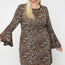 Made In U.S.A 1XL.2XL.3XL Cheetah print dress featuring flattering bell sleeves and a round neck. 33% Rayon 64% Polyester 4% Spandex Brown Cheetah POL