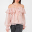 Imported S.M.L A woven top featuring off shoulder neckline with halter tie, ruffled overlay, long sleeves with elasticized wrist 100% Polyester Deep Pink SAL