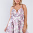 Imported1XL.2XL.3XLMauve floral print, sleeveless, v-neck, padded chest, open back, strappy back detail, back zipper closure, mini length, flare skirt, unlined, some stretch, sexy, flirty, summer95% Polyester 5% SpandexMauveTSH