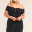 Black, tight fitted, bodycon, off-the-shoulder mini sleeve, top-to-bottom front zipper fly closure, hidden hook-and-eye closure, lined, stretchy, sexy, club wear, date night, night out, party look, spring/summer collection