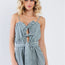 Imported S.M.L. adjustable cami straps, checkered white print, front layered bow cut out, elastic cinched waist, self tie waist sash, mini length, short shorts, unlined, stretchy. 100% Cotton Green TSH