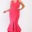 Solid coral-pink, sleeveless, v-neck, deep front slip, layered bottom, flare hem on the frame, mermaid cut, fitted, lined, stretchy, back hidden zipper and hook&eye closure, maxi length, sexy, night out, club wear, party look, elegant, black tie attire