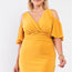 Imported 1XL.2XL.3XL solid, off-the-shoulder elasticized short flare sleeve, non-adjustable shoulder straps, front and back plunging wrap V-neckline, gathered sides waistline, tube bottom, fitted, stretchy, lined, mini length, chic, special occasion, cocktail & party wear, holiday look, flirty, date look, color pop, stylish, fall/winter chic collection 94% Polyester 6% Spandex Mustard TSH