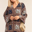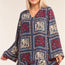 Navy, mixed color and print, deep plunge V-neck, long angel sleeve, flounce hem, back loop closure with antique design button, lined, non-stretch, casual