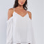 Made In U.S.A XS.S.M.L White, relaxed fit, V-neck, off-the-shoulder with stretchy ruffle hem, adjustable straps, razor back, lined, buttoned cuff long sleeves, business casual, spring/summer collection 100% Polyester White TSH