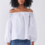 White, multi color shoulder stitches, off-the-shoulder, long balloon sleeve with elasticated hem, smock shoulder detail, relaxed fit, unlined, non-sheer, semi-stretchy, breathable, cotton, day on the beach, summer look