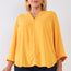 Tuscan sun yellow, solid color and construction, V-neckline, button closure roll-up straight midi sleeve, pleated back detail, relaxed fit, uneven front & back length, tunic length, unlined, non-sheer, non-stretch, casual, sophisticated, color pop, spring/summer collection