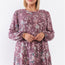 Made In U.S.A 1XL.2XL.3XL Washed faded burgundy, floral print, round neckline, long slightly puffed sleeve with elasticized mini-cuff, relaxed fit, unlined, stretchy, mini length, casual, cute, girly, soft to touch, fall/winter collection 63% Polyester 33% Rayon 4% Spandex Burgundy Floral TSH