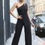 Imported S.M.L One shoulder jumpsuit w/ small opening. Frontline Flared Leg Design, Back zipper 95% Polyester 5% Spandex Black VAL